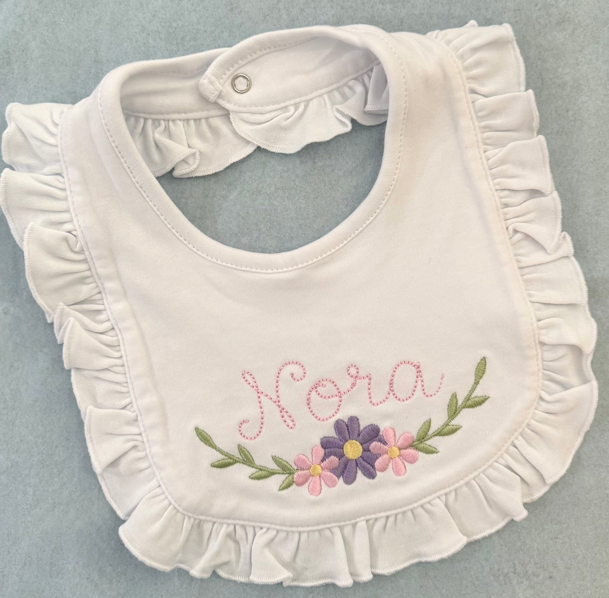 Soft cotton knit bib with snap closure and ruffle trim. Make this bib truly personal by choosing one of our many frames, designs and embellishments, or from any of our monogram styles.